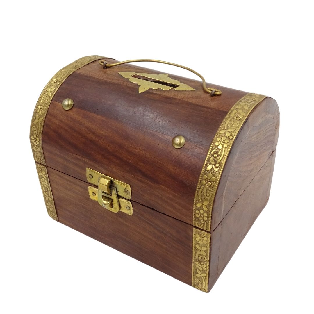 Fabriquée en bois de haute qualité avec des détails exquis sculptés à la main, cette tirelire est à la fois belle et fonctionnelle. Son design authentique de coffre au trésor, avec des ferrures métalliques et une serrure à rabat, évoque l'esprit des aventures maritimes.